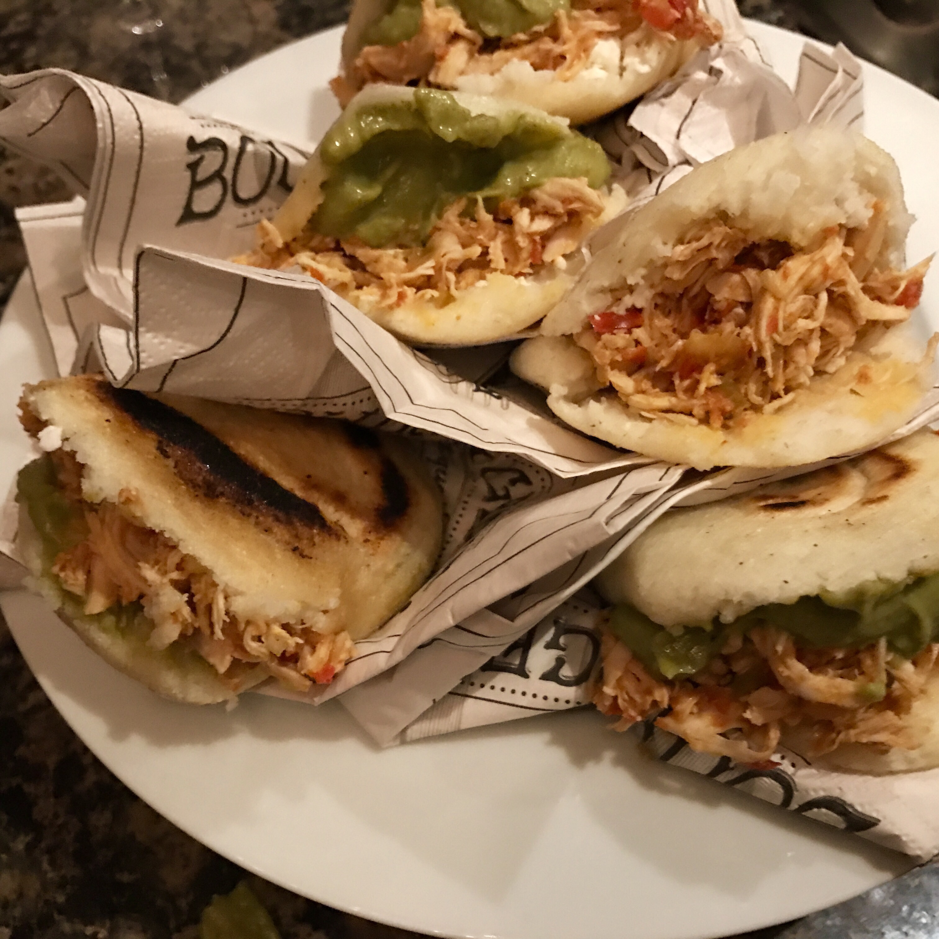 It takes me back to my childhood on my grandparent’s farm in Venezuela. This are 100% homemade, traditional food made with locally grown corn cobs and there are several variations of these! It’s origins go back 100s of years. A stuffed arepas can be eaten filled with savoury fillings like shredded beef, pork or vegetarian but this arepas was made with chicken. Super filling, healthy traditional food. In the UK you can buy HARINA PAN provided by Empresaspolar.com